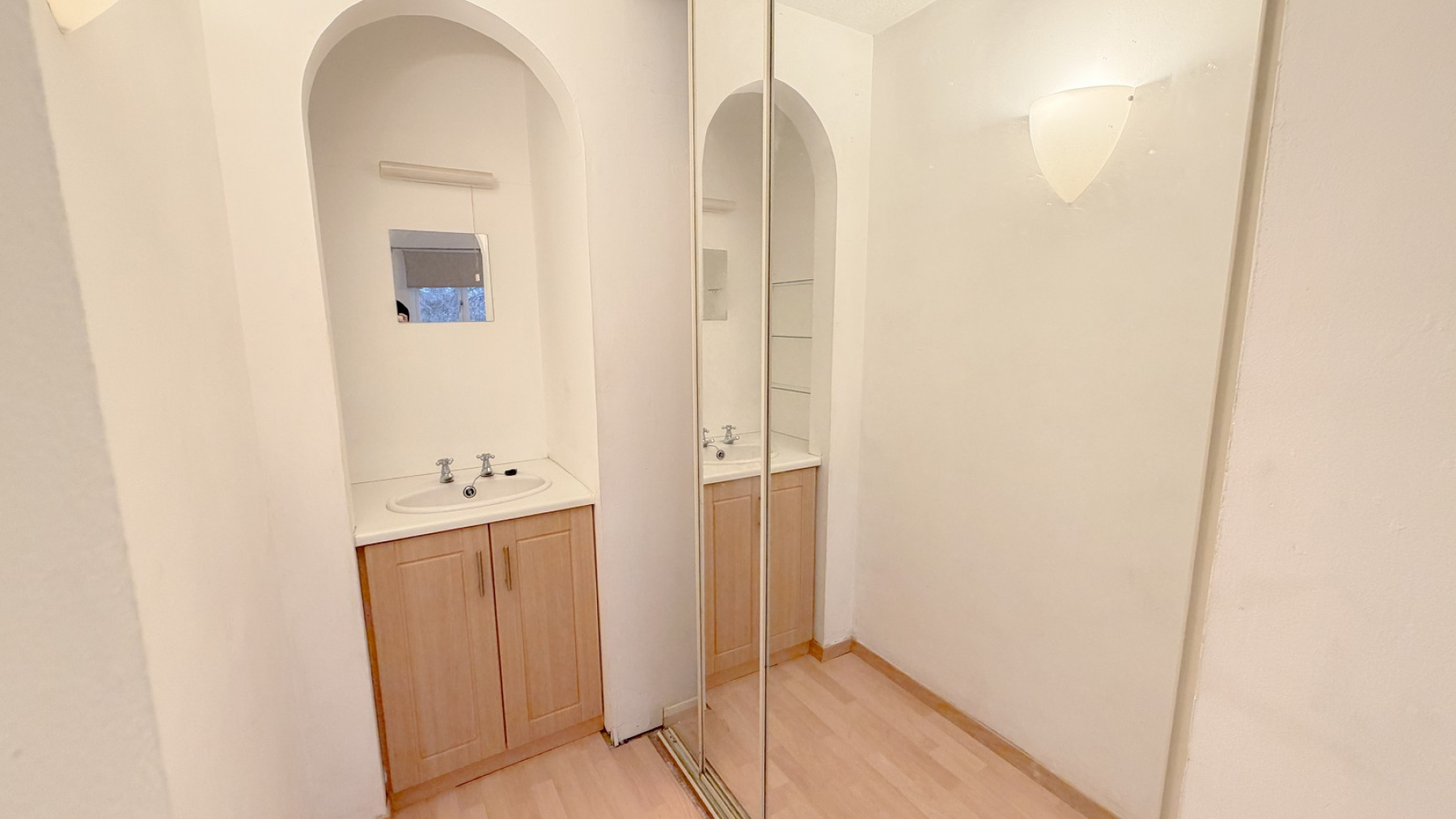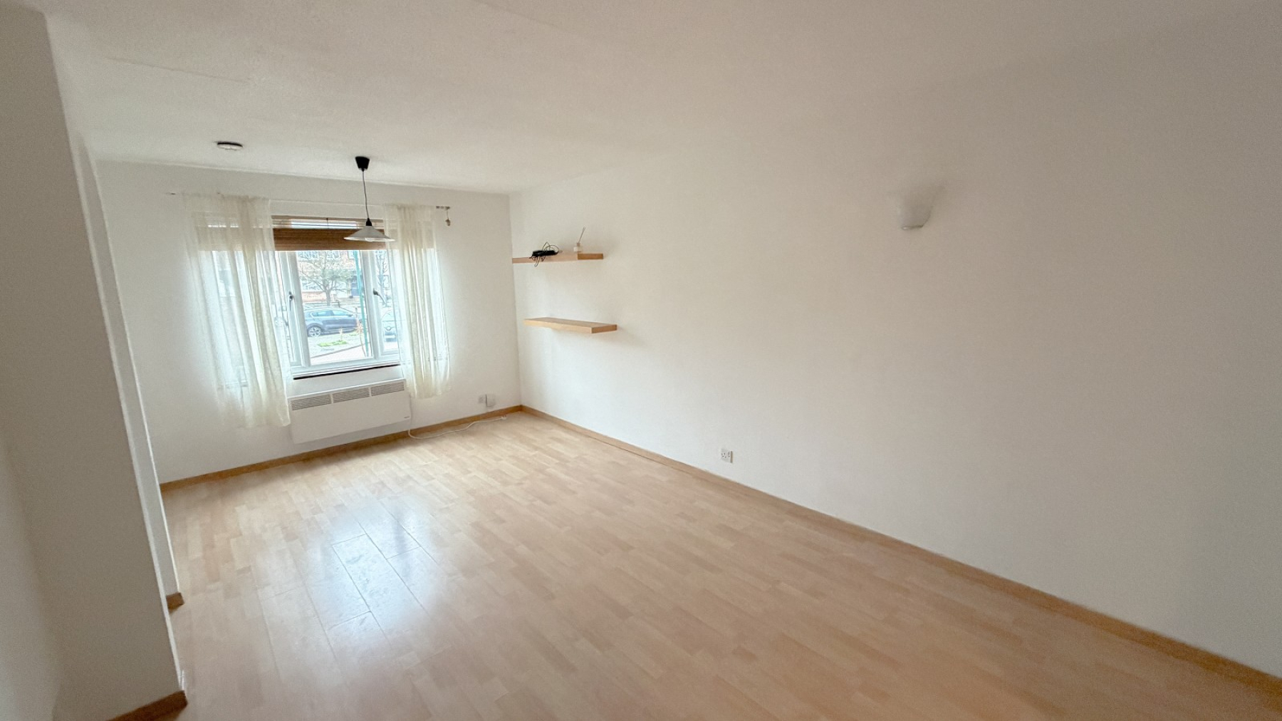 Double glazed window, laminate wood flooring, electric wall heater, tv point, power points, display alcove with light, 3 tier shelving