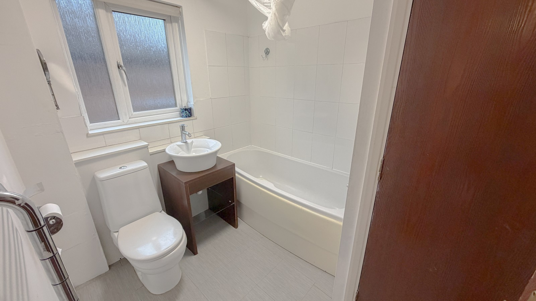 Double glazed frosted window, part tiled walls, panelled bath with electric shower over, low level wc, modern ceramic hand basin, electric wall heater