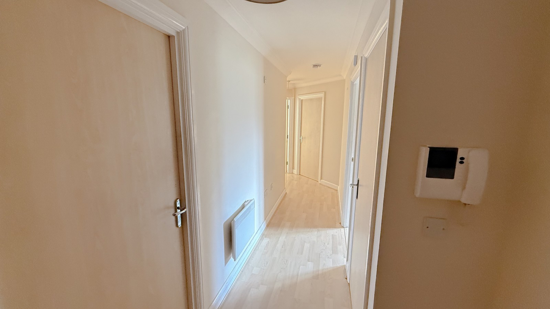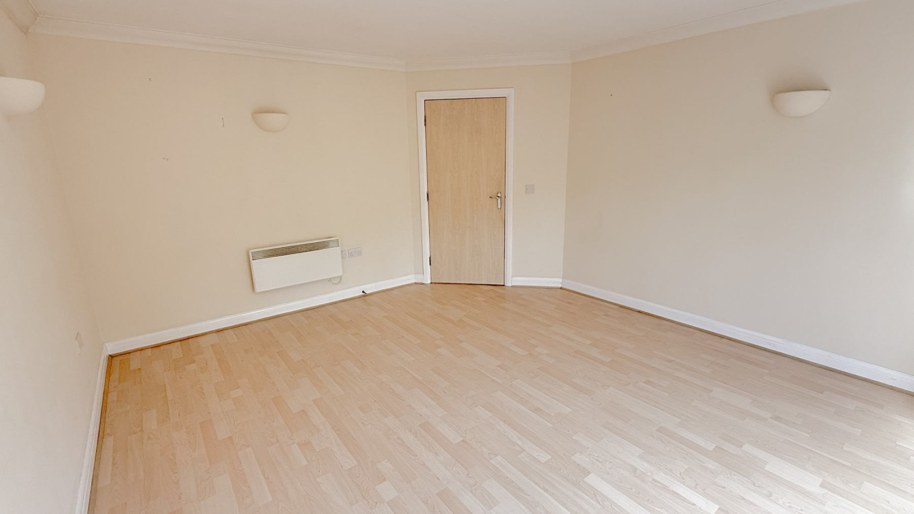 Double glazed door with side windows &picture balcony (overlooking communal garden), laminate wood flooring, night storage heater, corniced ceiling, tv point, power points.