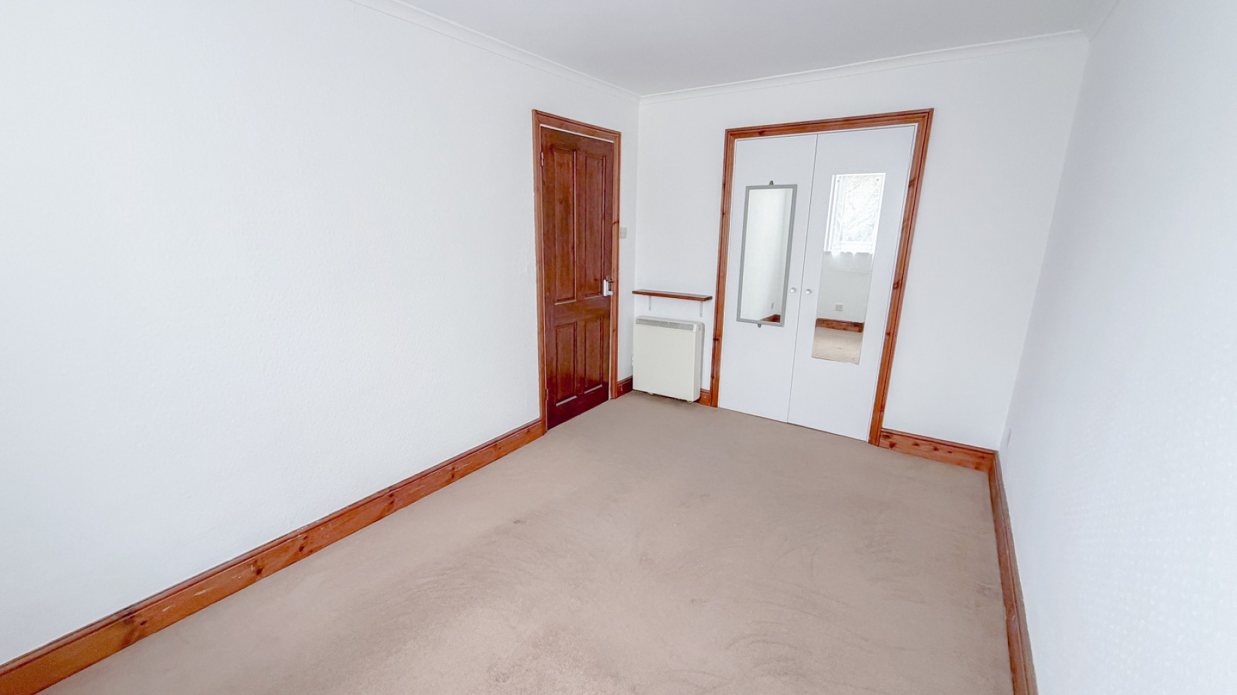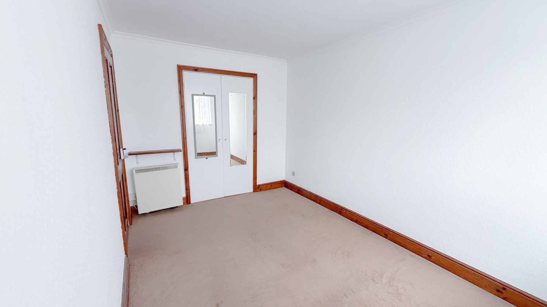 Double glazed window, storage heater, coved ceiling, built in cupboard with shelves & rail, power points.