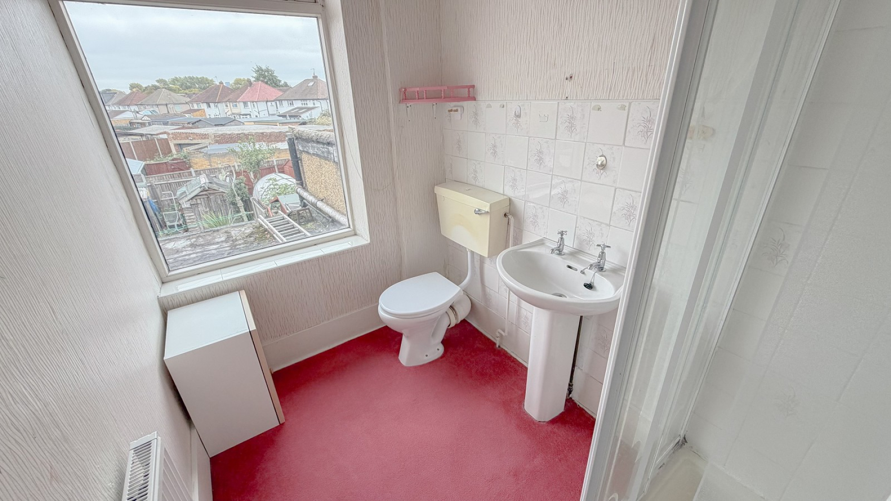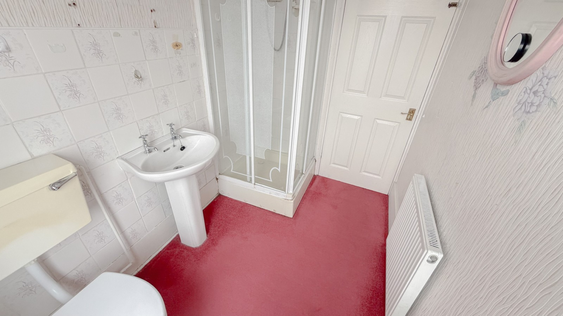 Double glazed frosted window, low-level wc, hand basin, shower cubicle, high ceiling, radiator