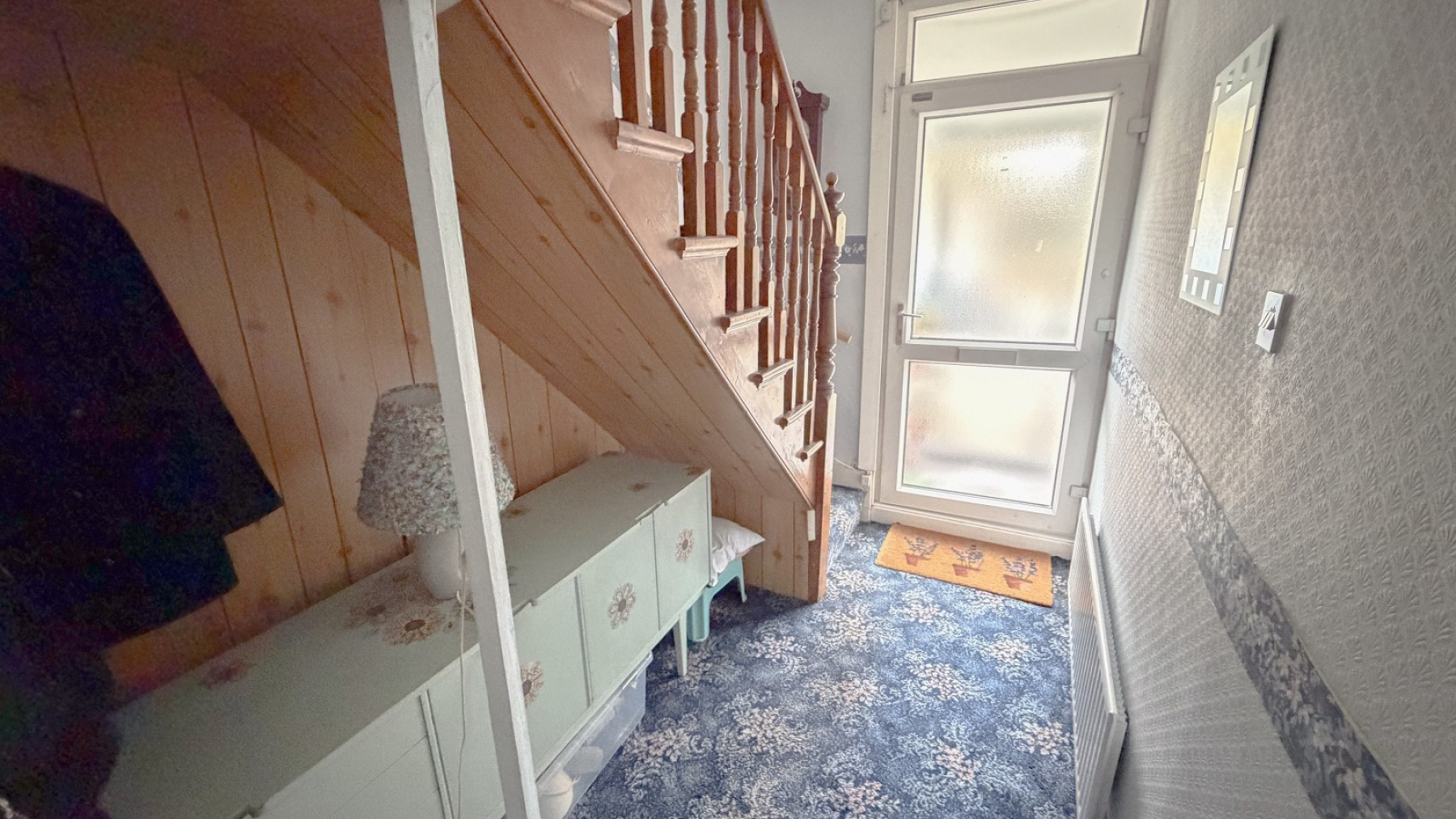 11' long. Double glazed front door, radiator, staircase with recess under, high ceiling.