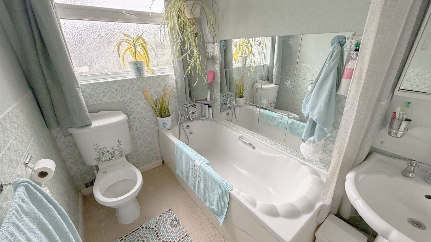 Double glazed frosted window, panels bath with shower mixer unit, wash hand basin, low level wc, radiator