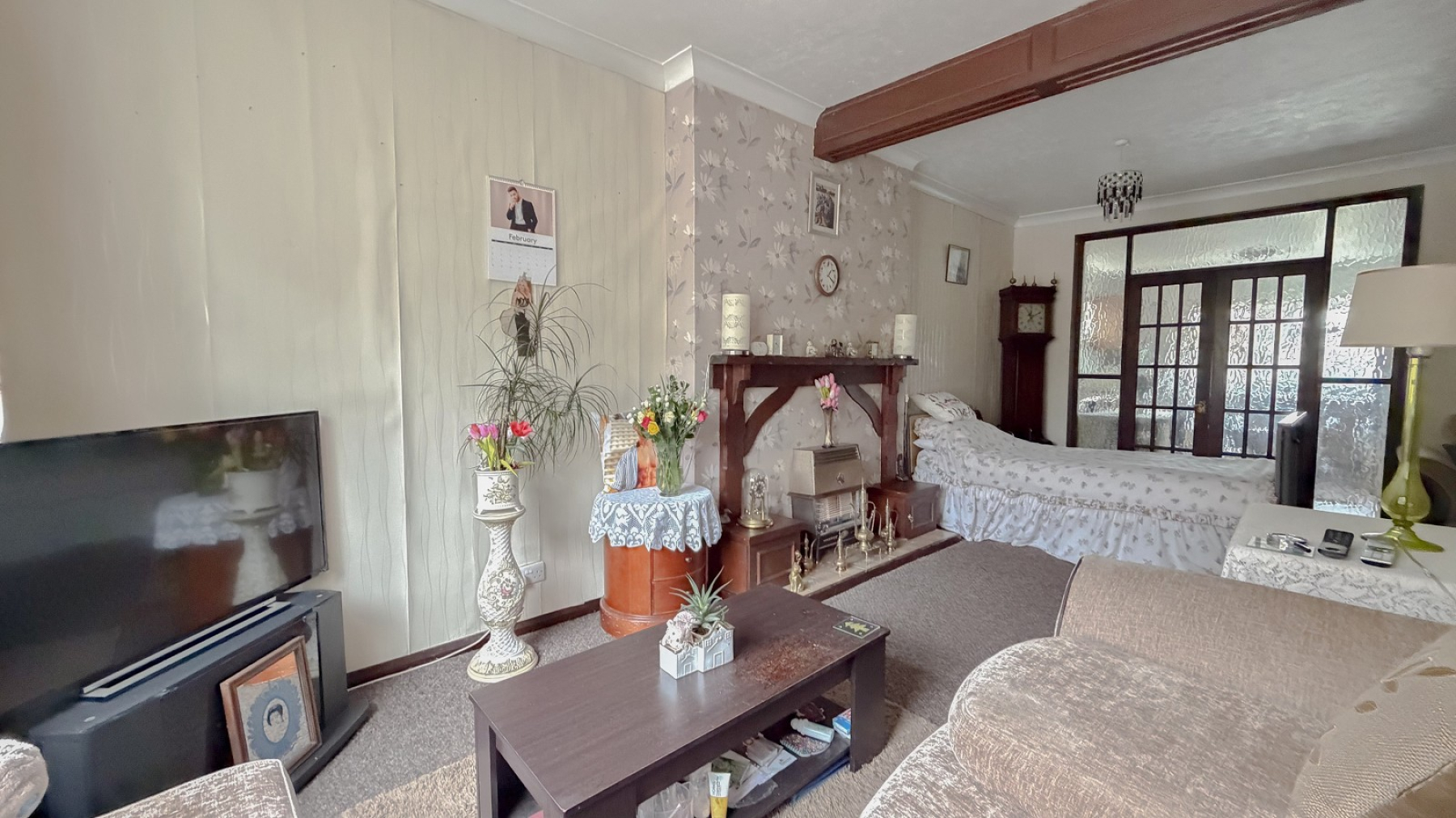 To rear of property- Rear garden with patio, lawn, borders & fencing (sheds will need to be taken down)