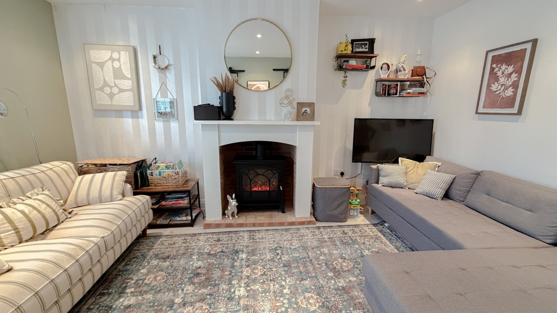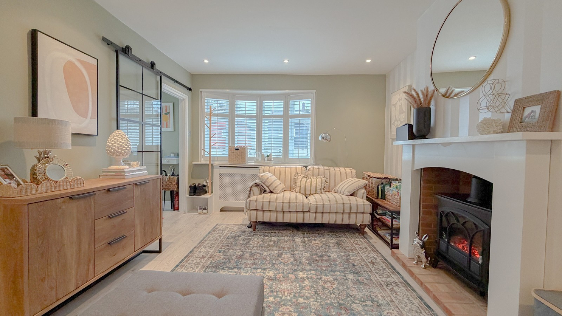 Double glazed window, custom fitted shutters, display Fireplace with flame effect wood burner with in built heater, inset lighting, laminate wood flooring, radiator with ornate cover, power points, underfloor heating with thermostat