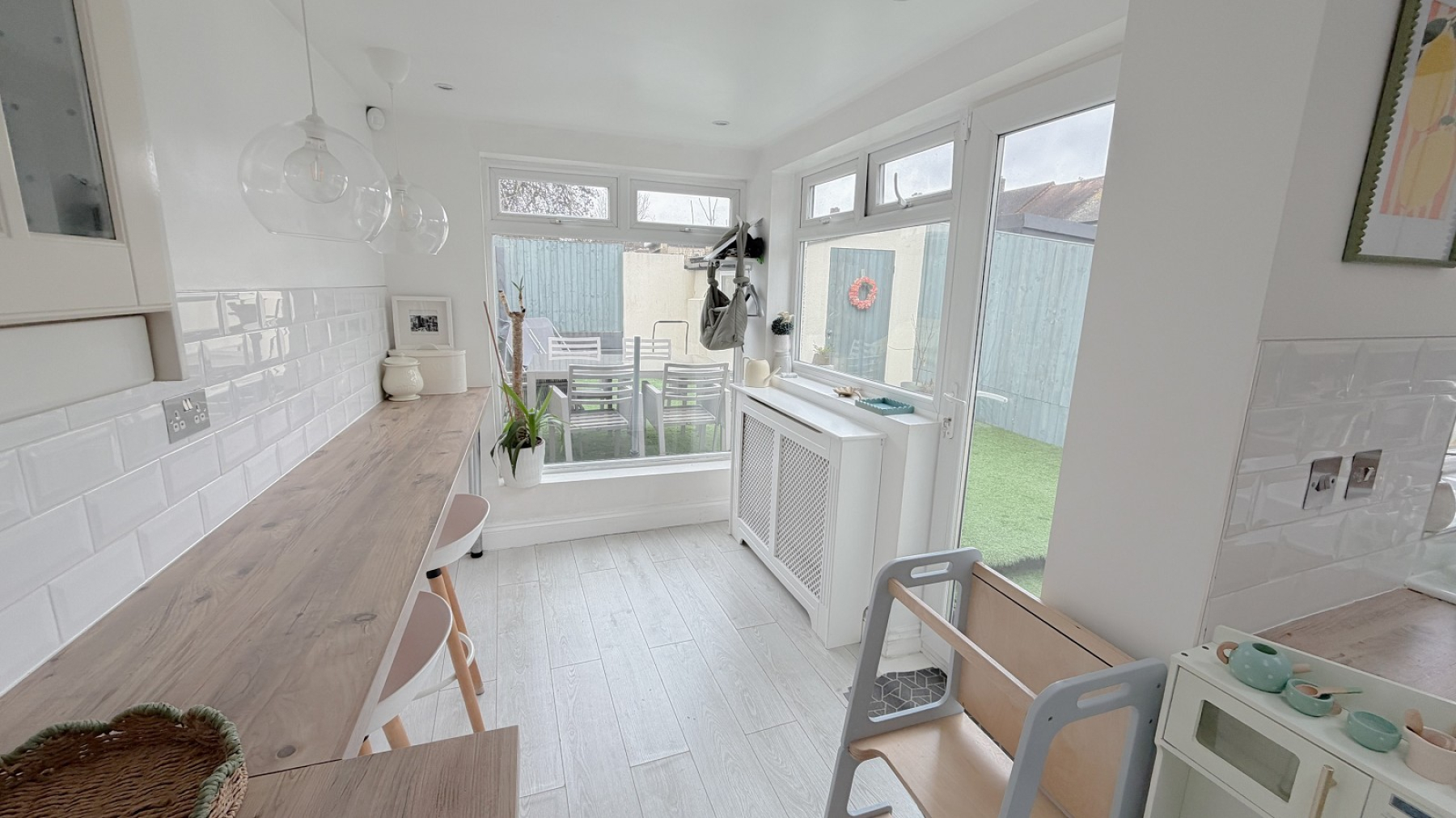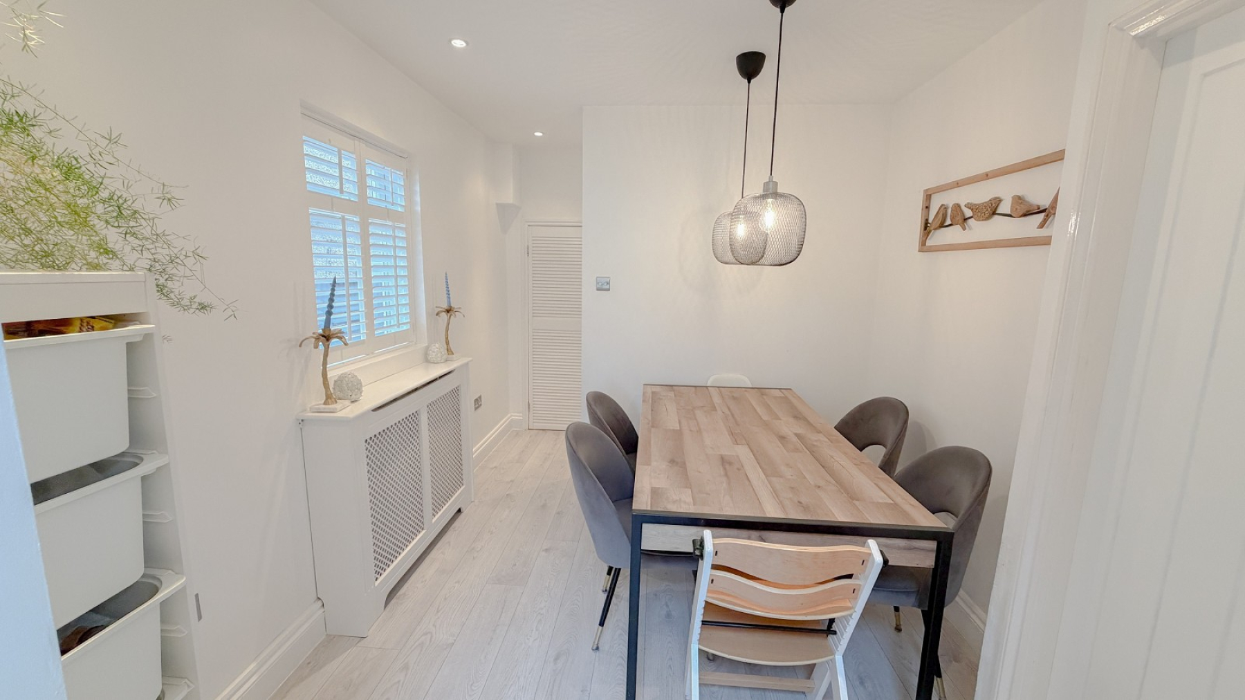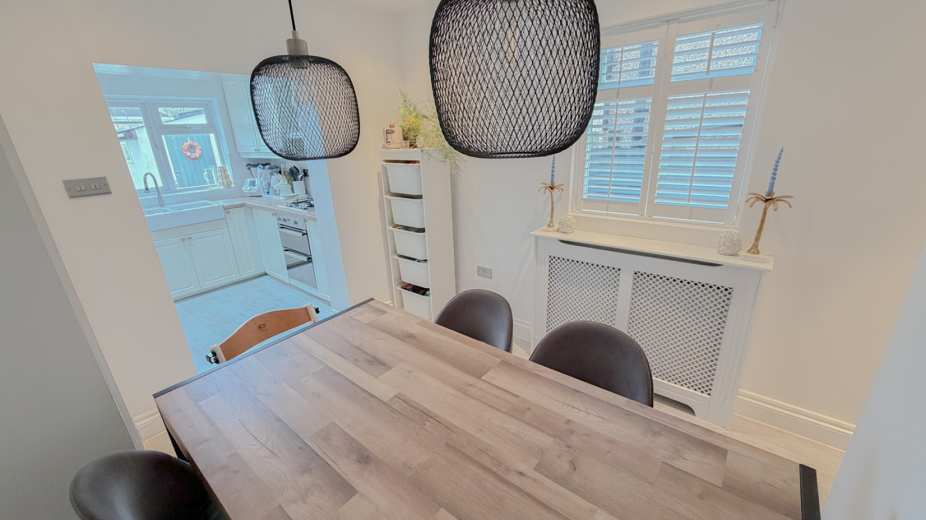 Double glazed window, custom fitted shutters, inset lighting, radiator with ornate cover, under stairs storage cupboard, space for table & chairs, laminate wood flooring, power points