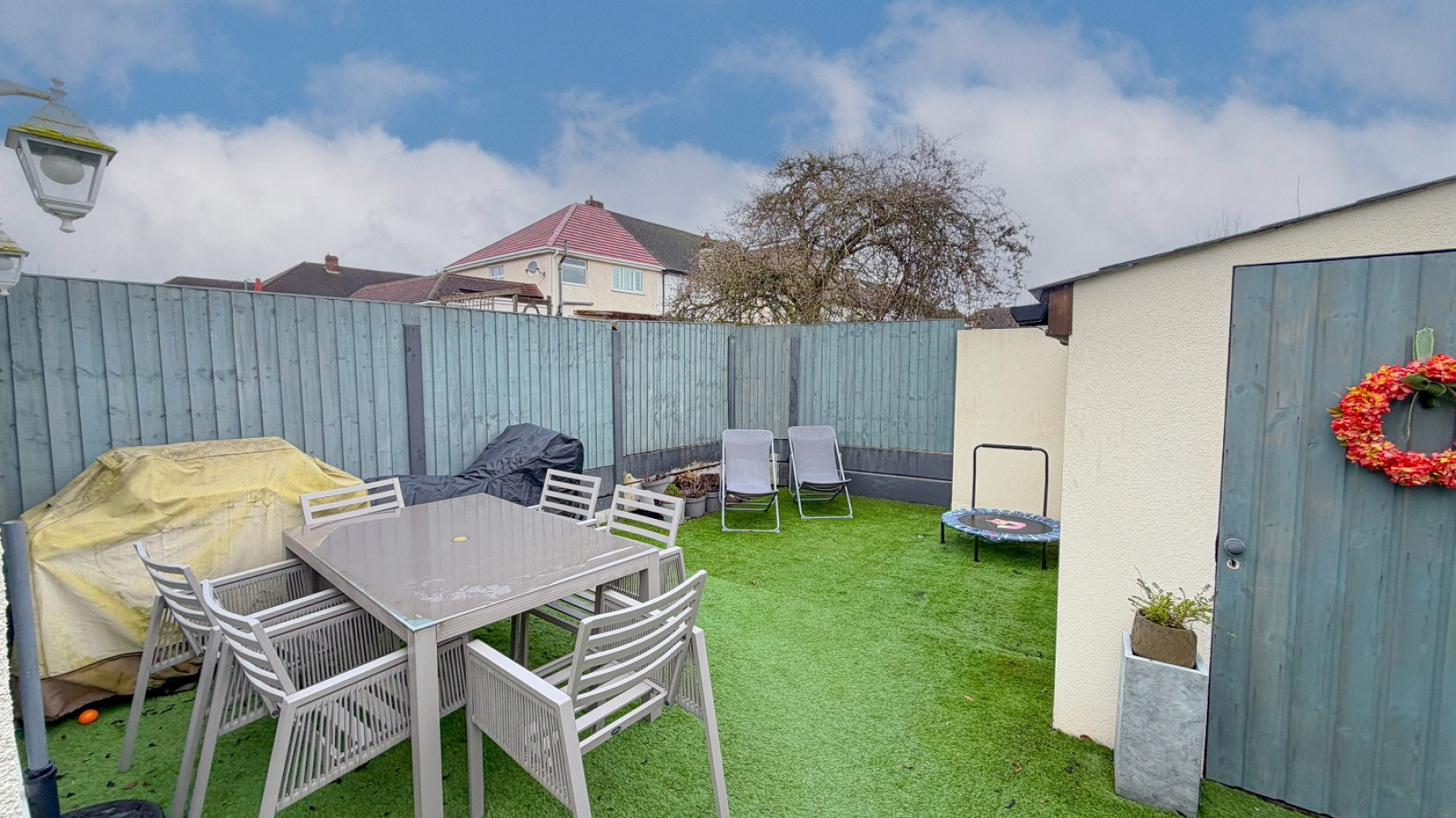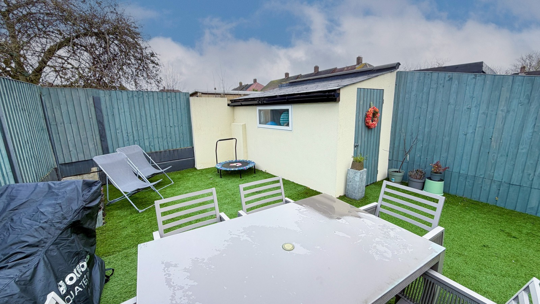 To rear of property- Easy to maintain garden with astro turf, fencing, tap, 11'7 brick built shed, side access.