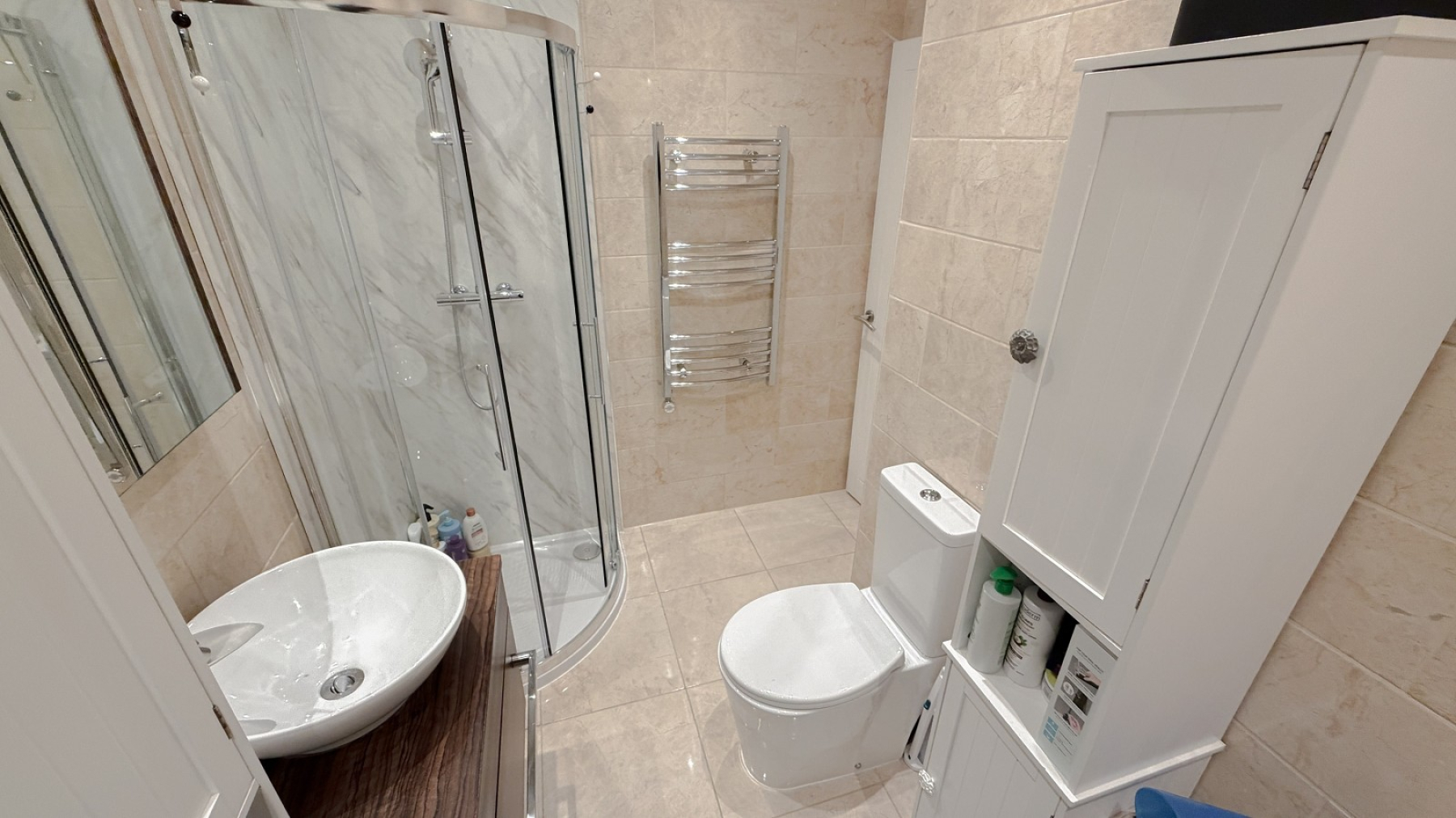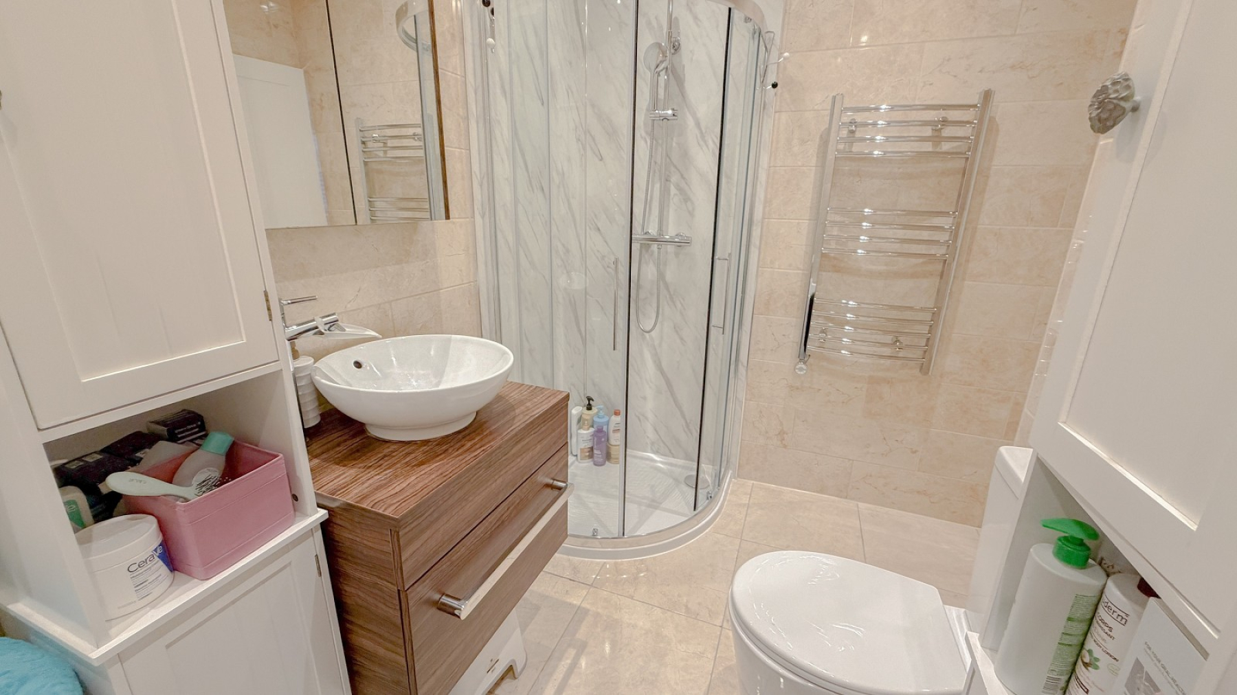 Fully tiled walls, custom free standing bath, separate shower cubicle, custom hand basin with drawers under, low level wc, inset lighting, extractor fan, heater towel
