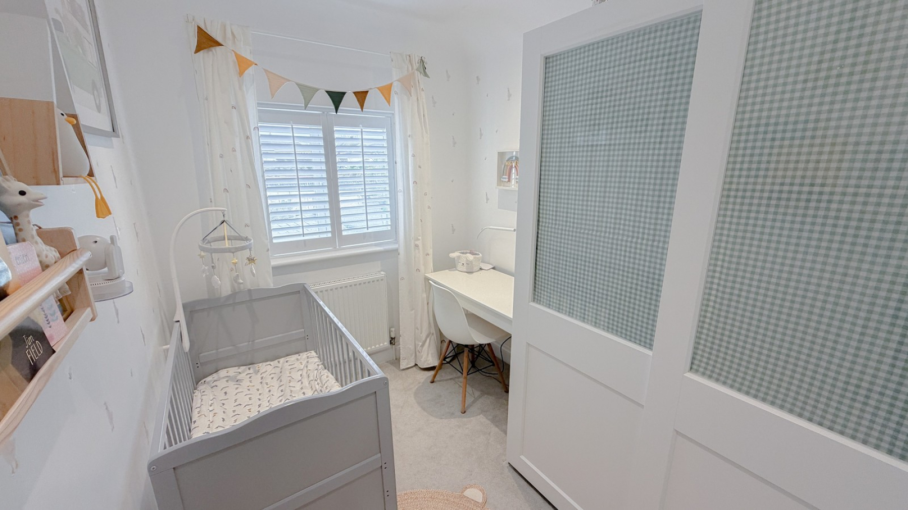 Double glazed window, custom fitted shutters, built in wardrobe, built in storage cupboard, range of fitted double wardrobes, radiator with an ornate cover, power points