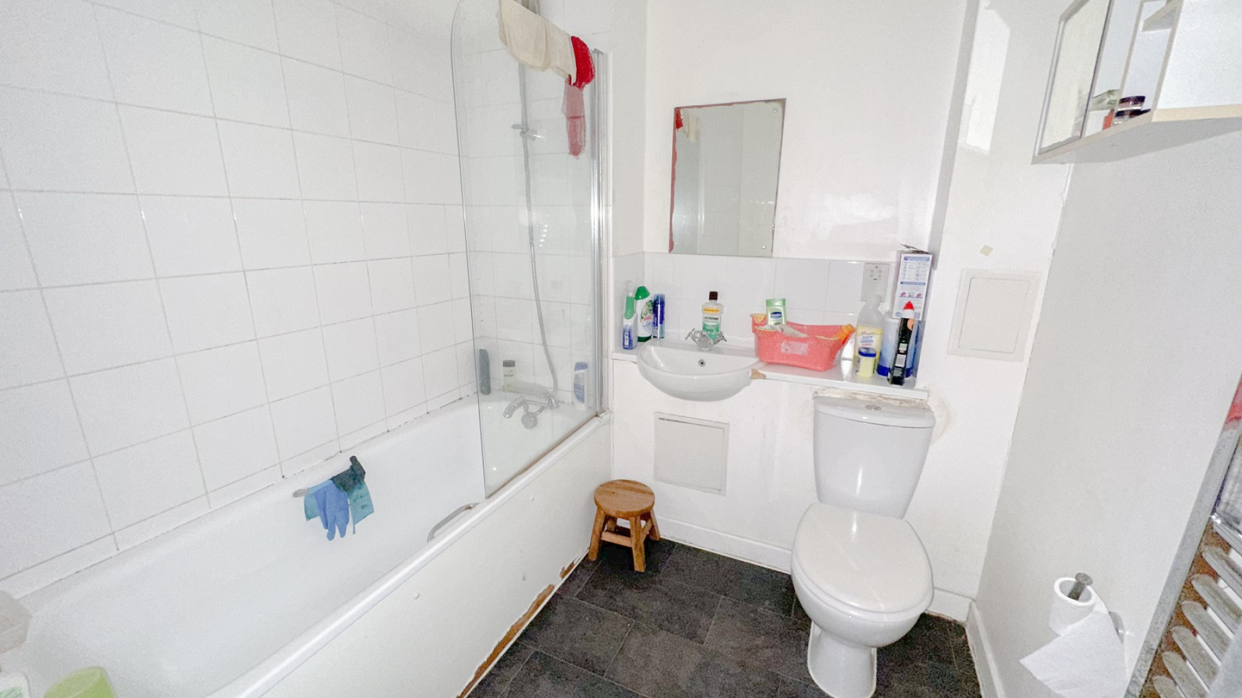 Part tiled walls, panelled bath with shower mixer unit & glass shower door, custom hand basin, low-level wc, heated towel rail, extractor fan