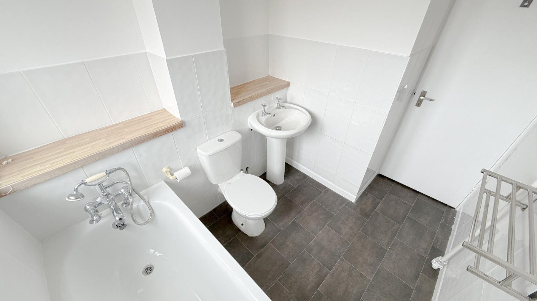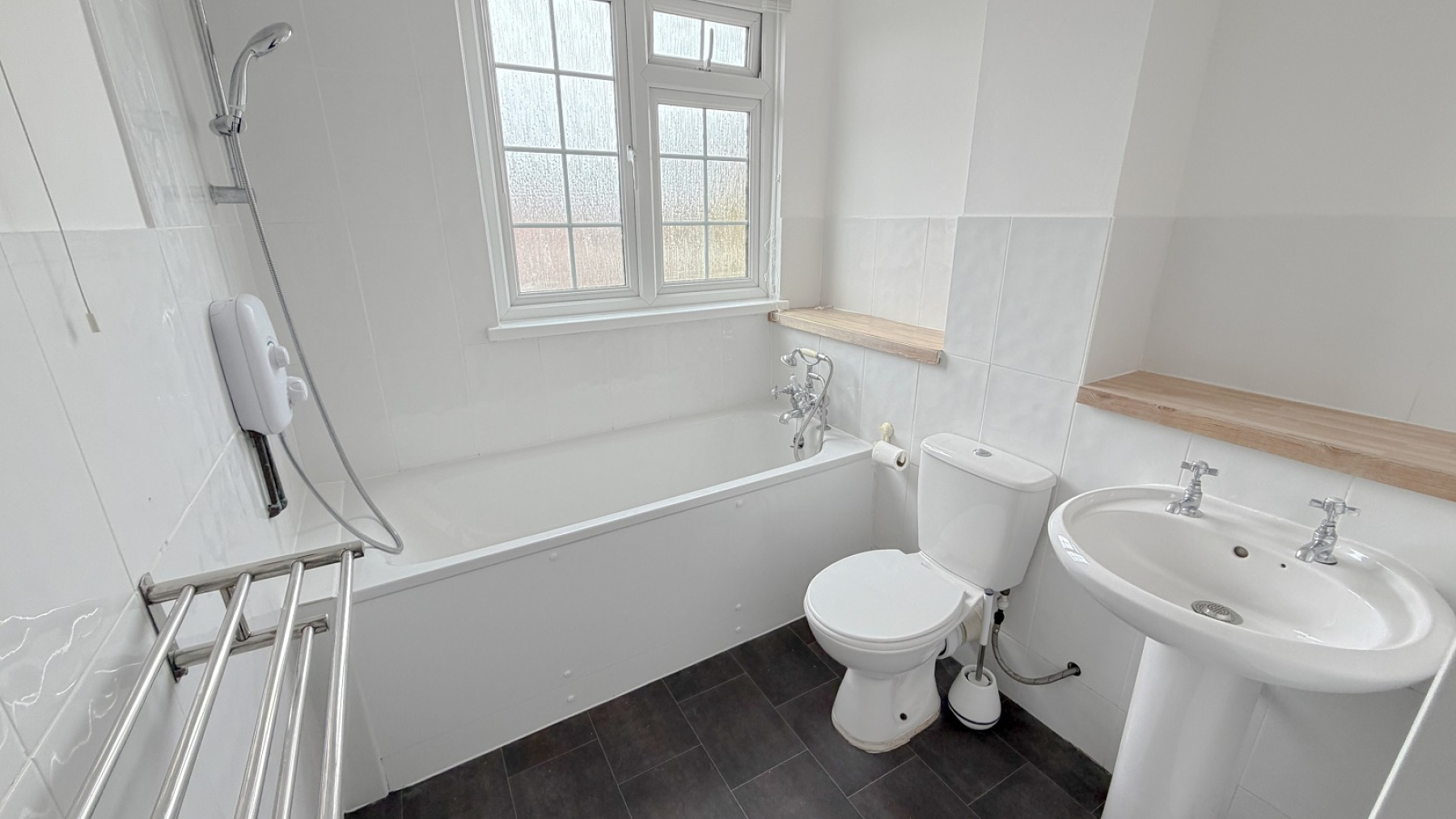 Double glazed frosted window, part tiled walls, panelled bath with electric shower over, hand basi, low level wc.