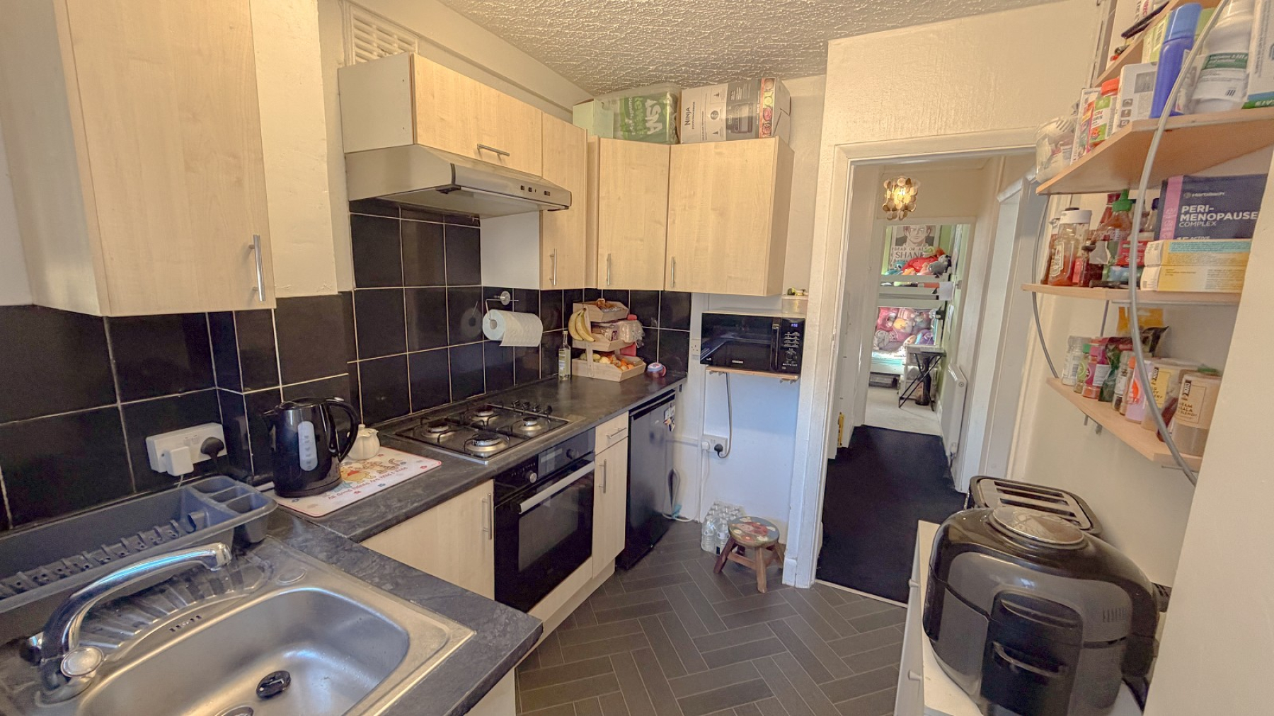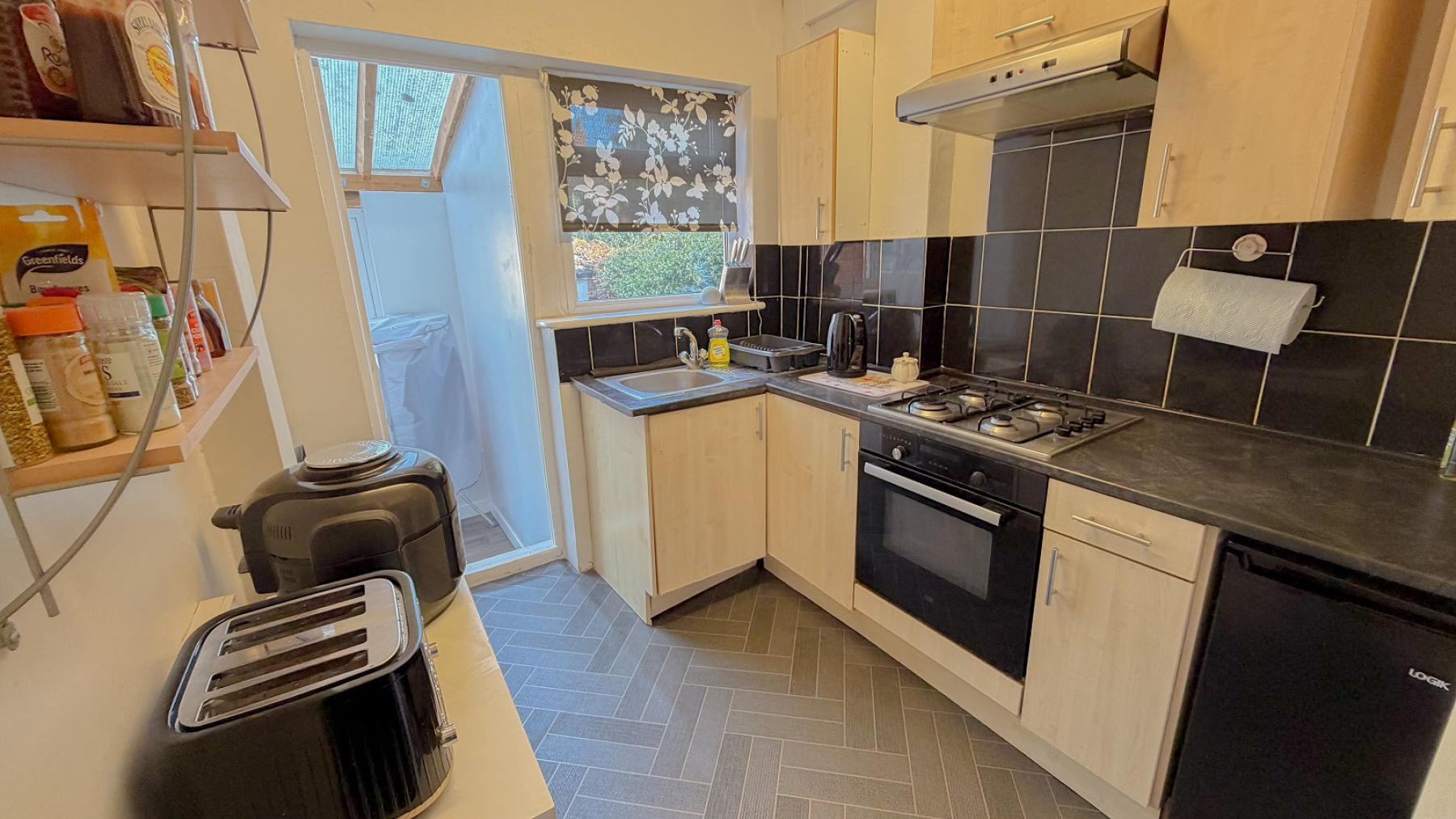Double glazed windows, laminate worktop, space for washing machine + dishwasher + fridge + freezer, power points, double glazed door to garden.