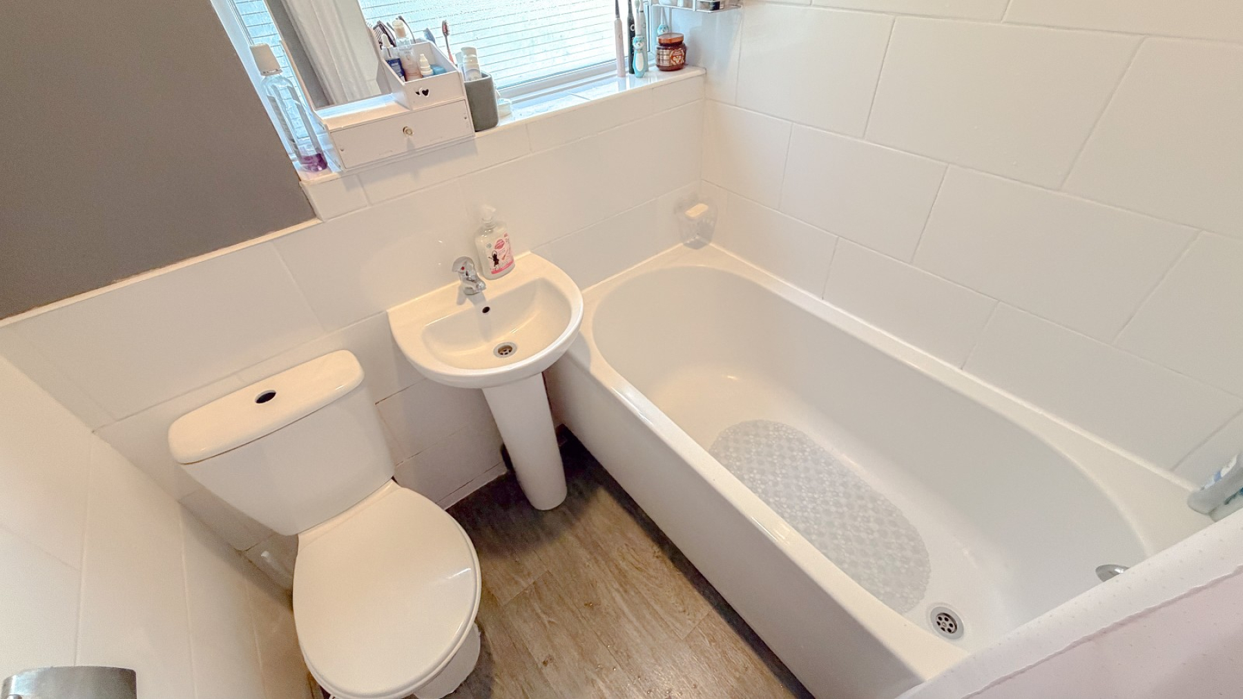 Frosted double glazed window, part tiled walls, paneled bath with shower mixer unit, low-level WC, wash hand basin