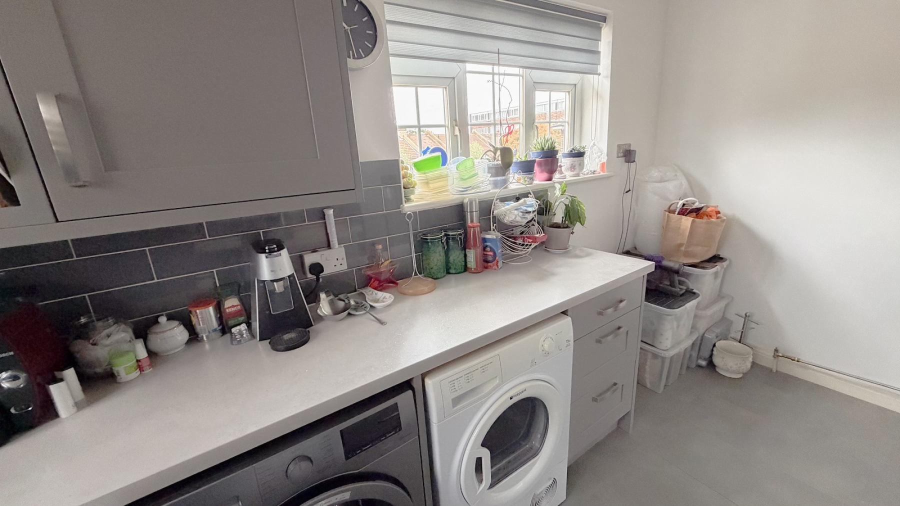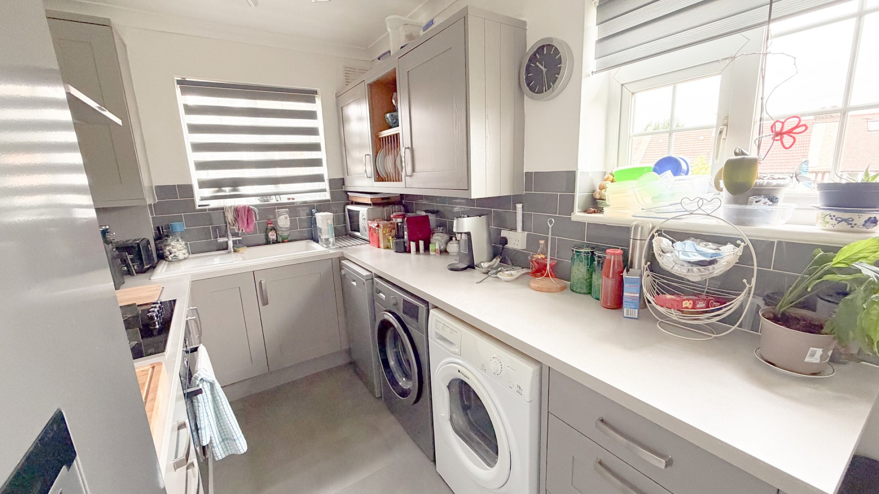Double glazed window, part tiling to walls, inset sink unit with drainer, range of wall and base units, cupboards and drawers, laminate work tops, inset gas hob, cooker hood, fitted electric oven, gas boiler, plumbed for washing machine, power points, space for table & chairs