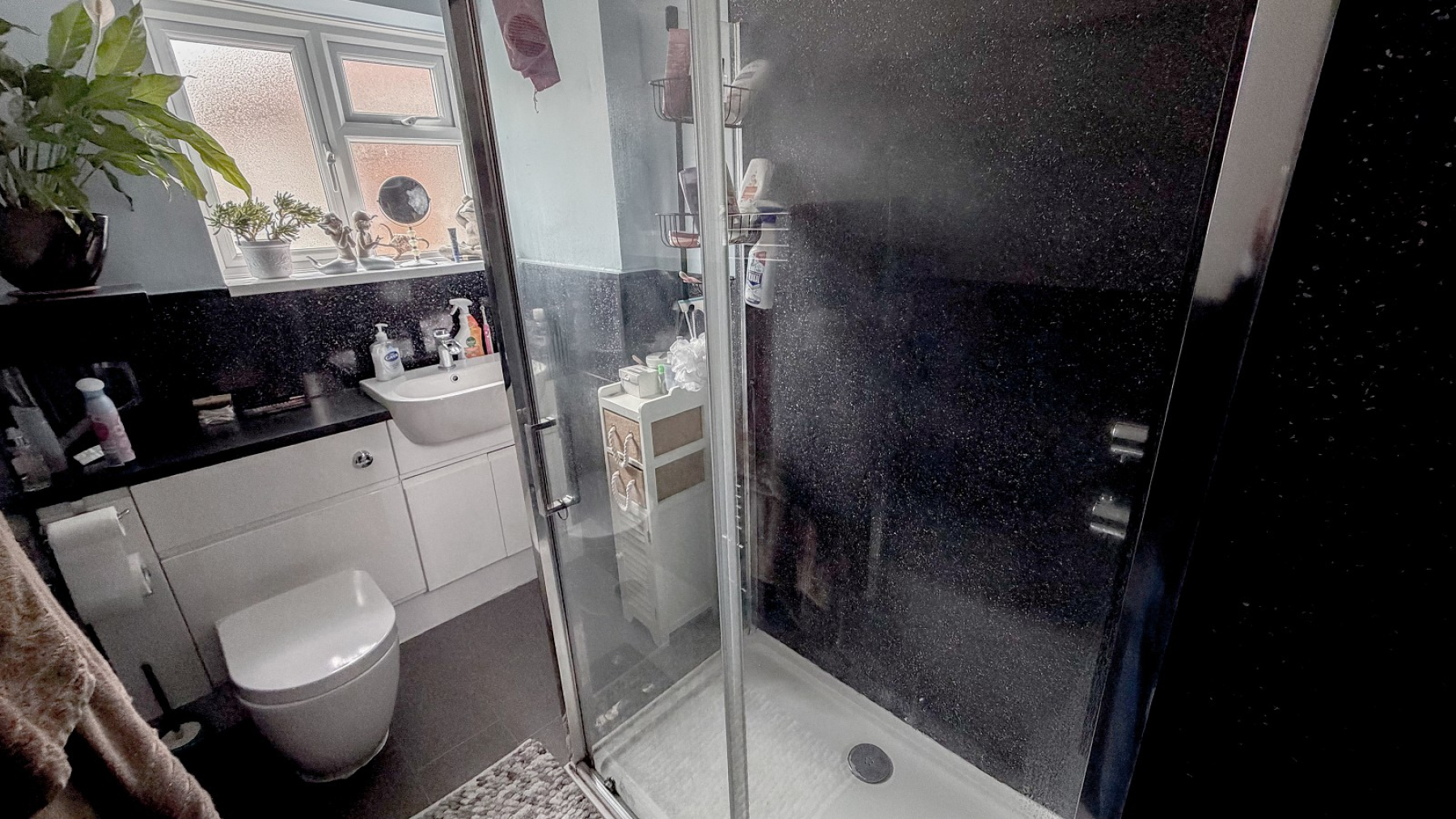 9'1 long, double glazed frosted window, part tiled walls, shower cubicle, custom hand basin unit with cupboards under, low level wc & heated towel rail,