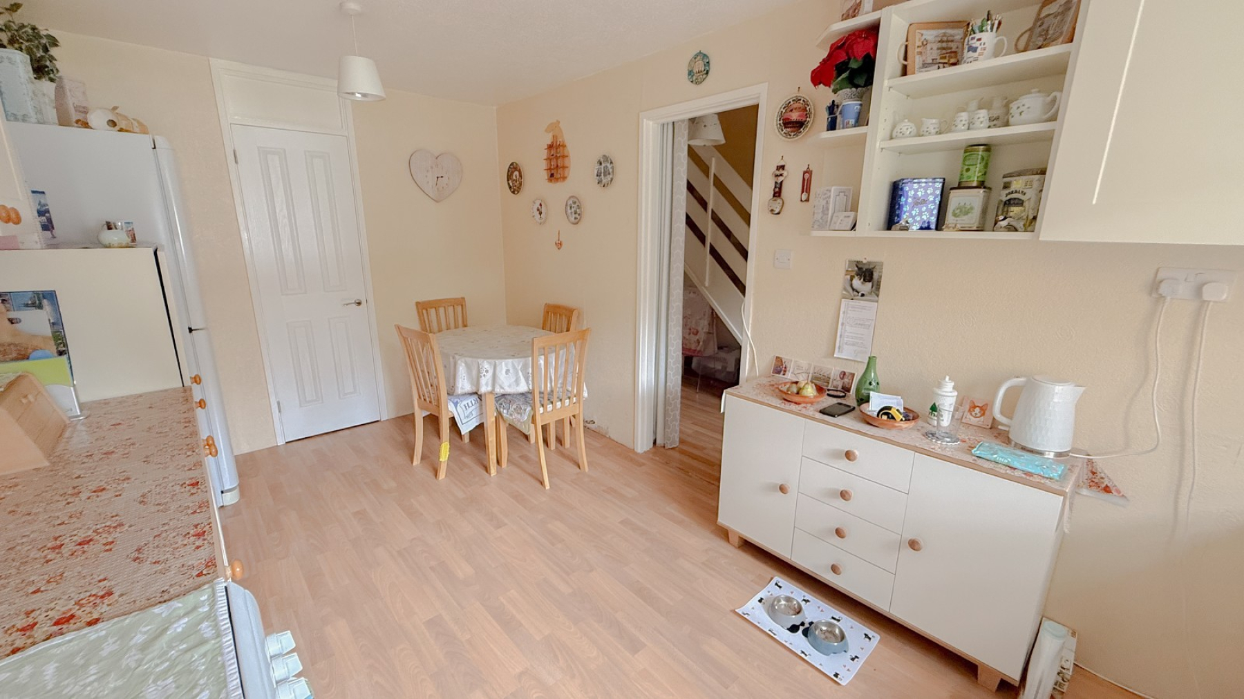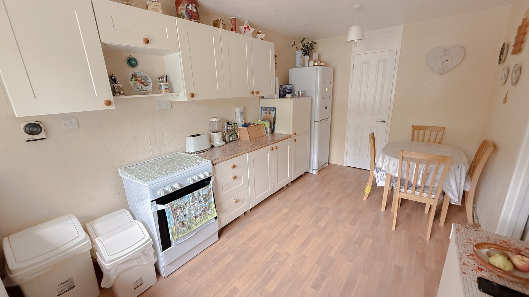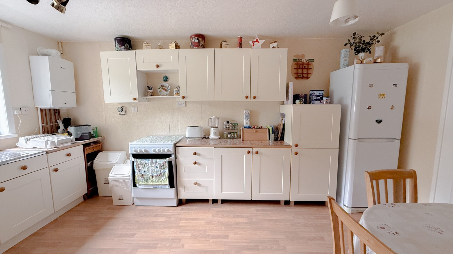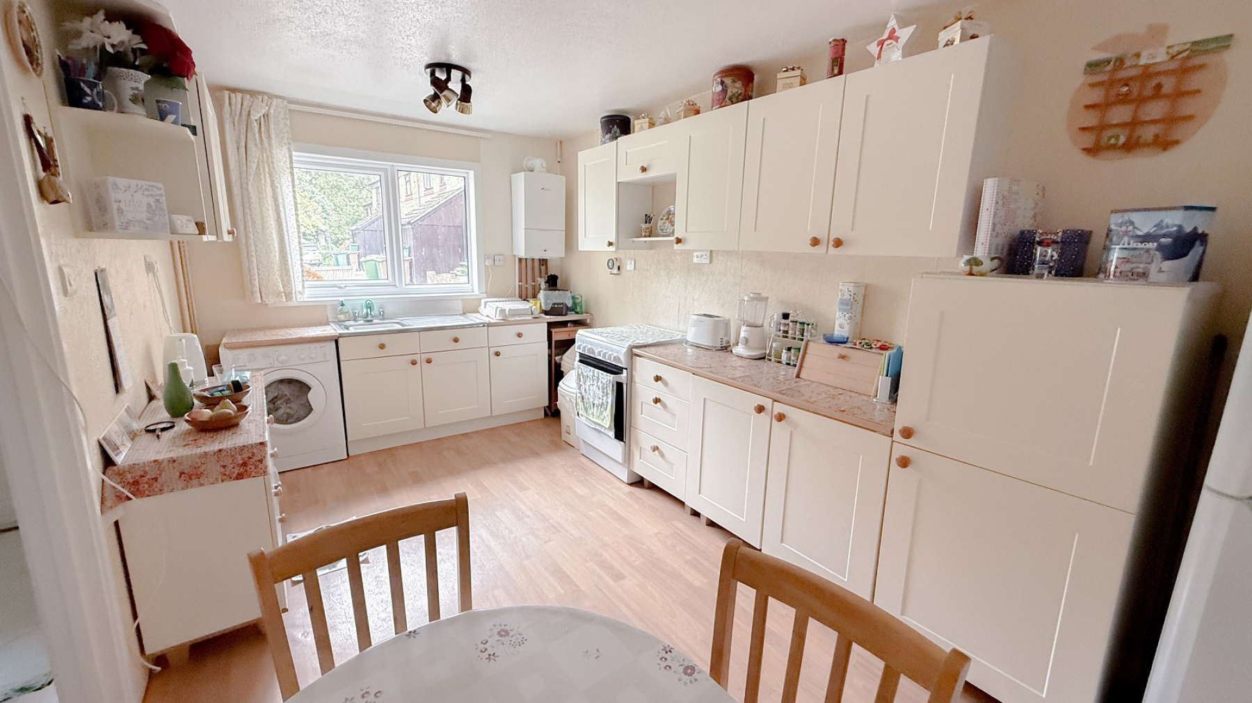 Double glazed window, inset sink unit with drainer, range and wall & base units, cupboards & drawers, laminate worktops, space for fridge freezer, plumbing for washing machine, space for cooker, power points, modern Worcester Bosch gas boiler, step in storage cupboard with shelving, space for table & chairs.