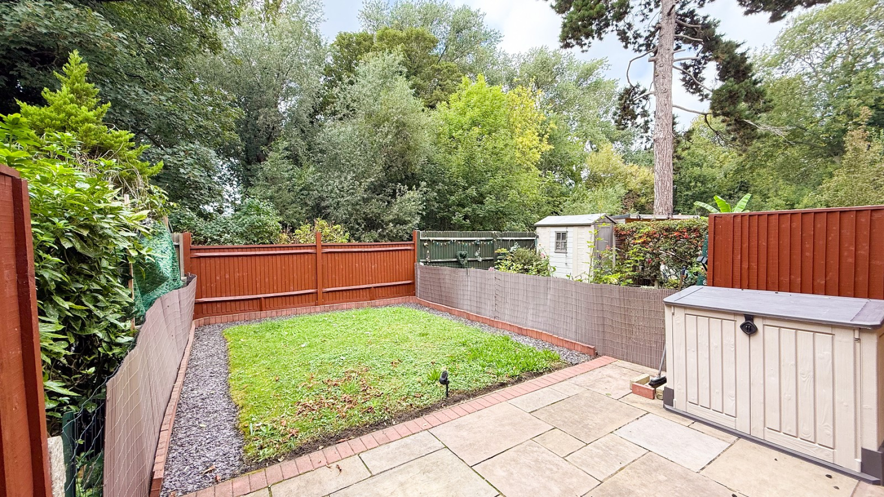 To rear of property- Landscaped garden with patio, lawn, slate chippings & fencing. Backing onto the river wandle.