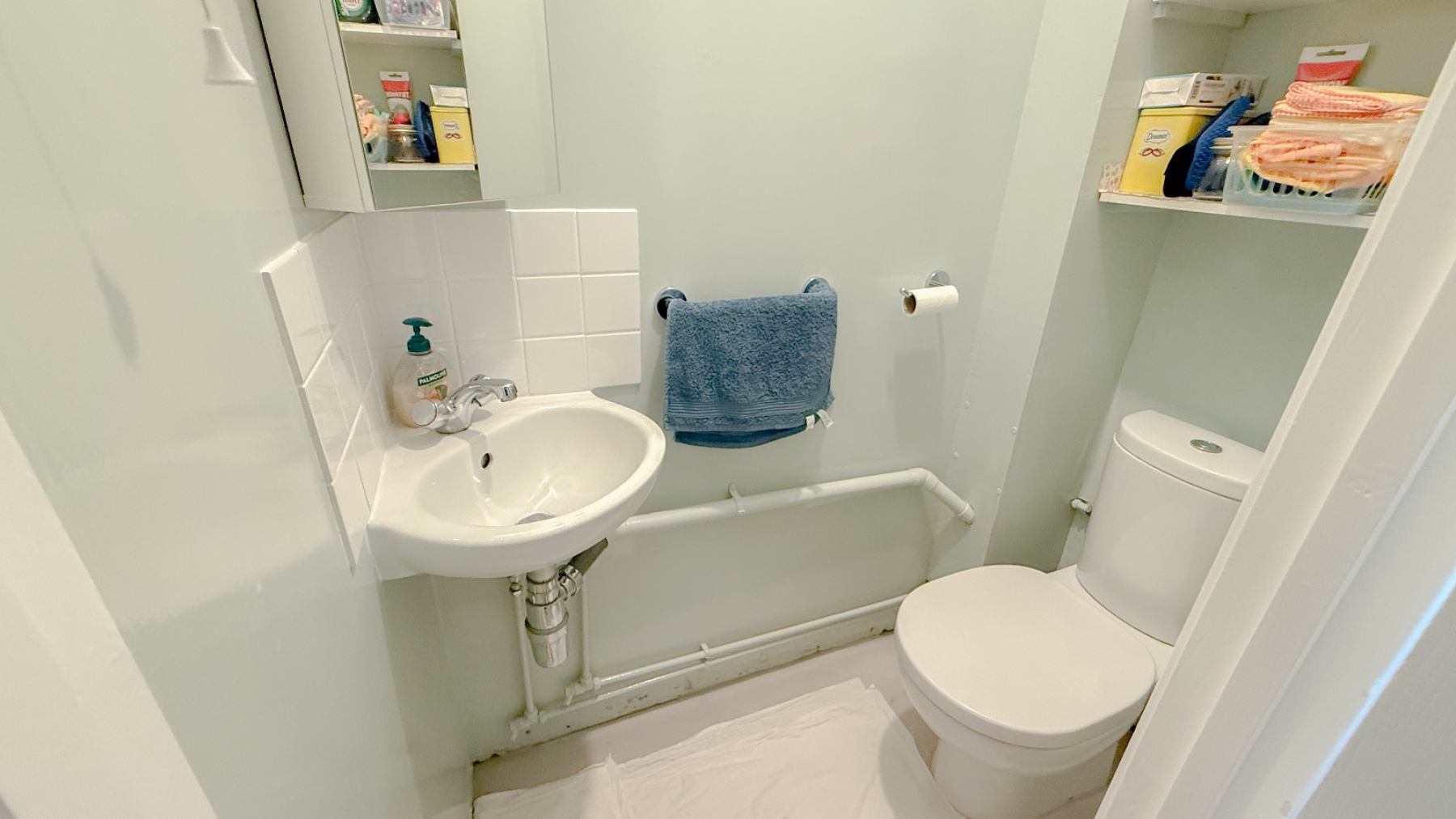 Wash hand basin, low-level WC, shelving