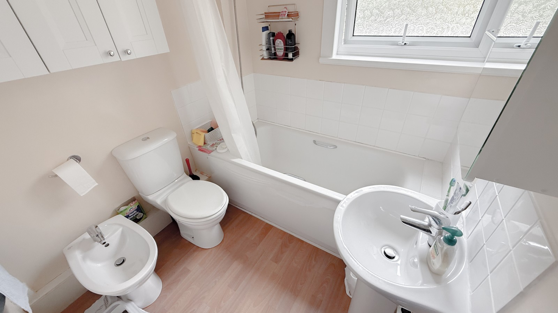 Double glazed frosted window, part tiled walls, panel bath with shower, low-level WC, bidet, wash hand basin, custom wall cupboards