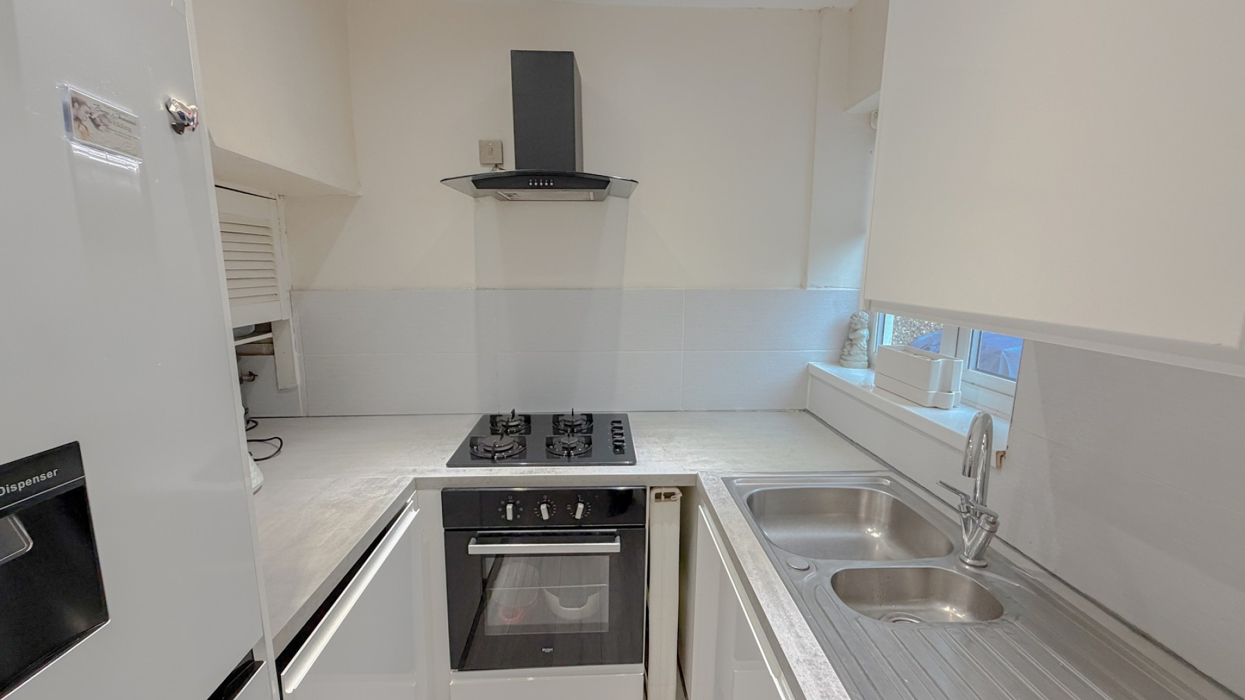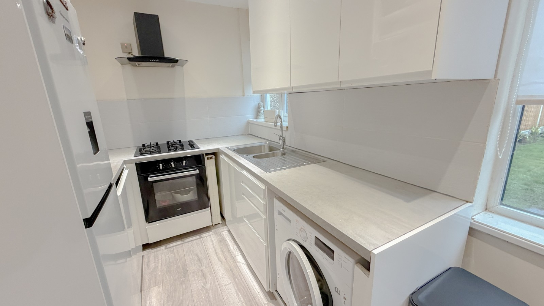 Just doubled glazed window, twin inset sink unit with drainer, range of wall & base units, cupboards & drawers, laminate work tops, inset gas hob, fitted oven, space for fridge freezer, modern cooker hood, laminate wood flooring, plumbing for washing machine, space for table & chairs, vertical radiator, power points, vailant gas boiler, double glazed door garden