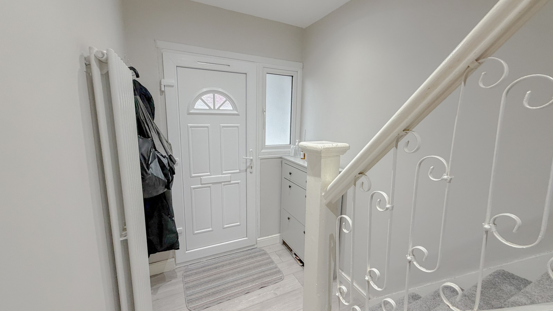 10'10 long. Double glazed front door with frosted double glazed side window, vertical radiator, laminate wood flooring, staircase with cupboard under, power points, inset lighting.