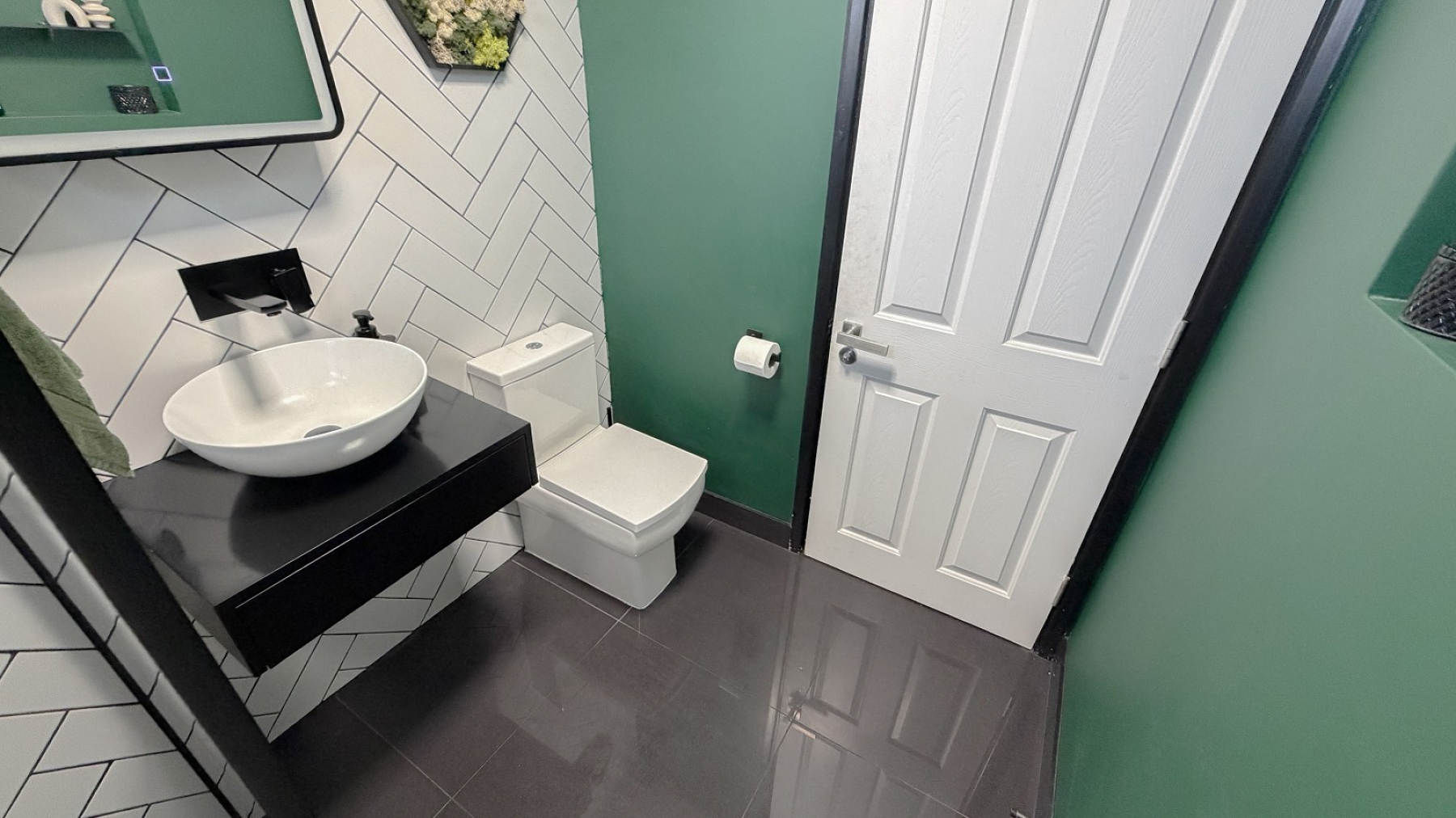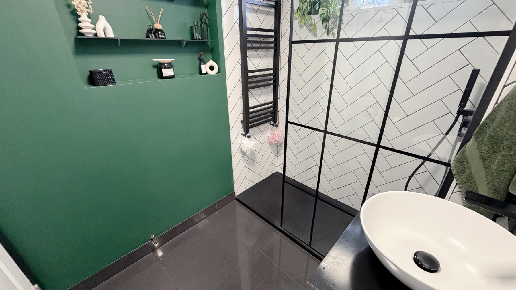 Frosted double glazed window, part tiled walls, Large walk in shower area, custom hand basin with drawer under, low level wc, heated towel rail, extractor fan, tiled floor