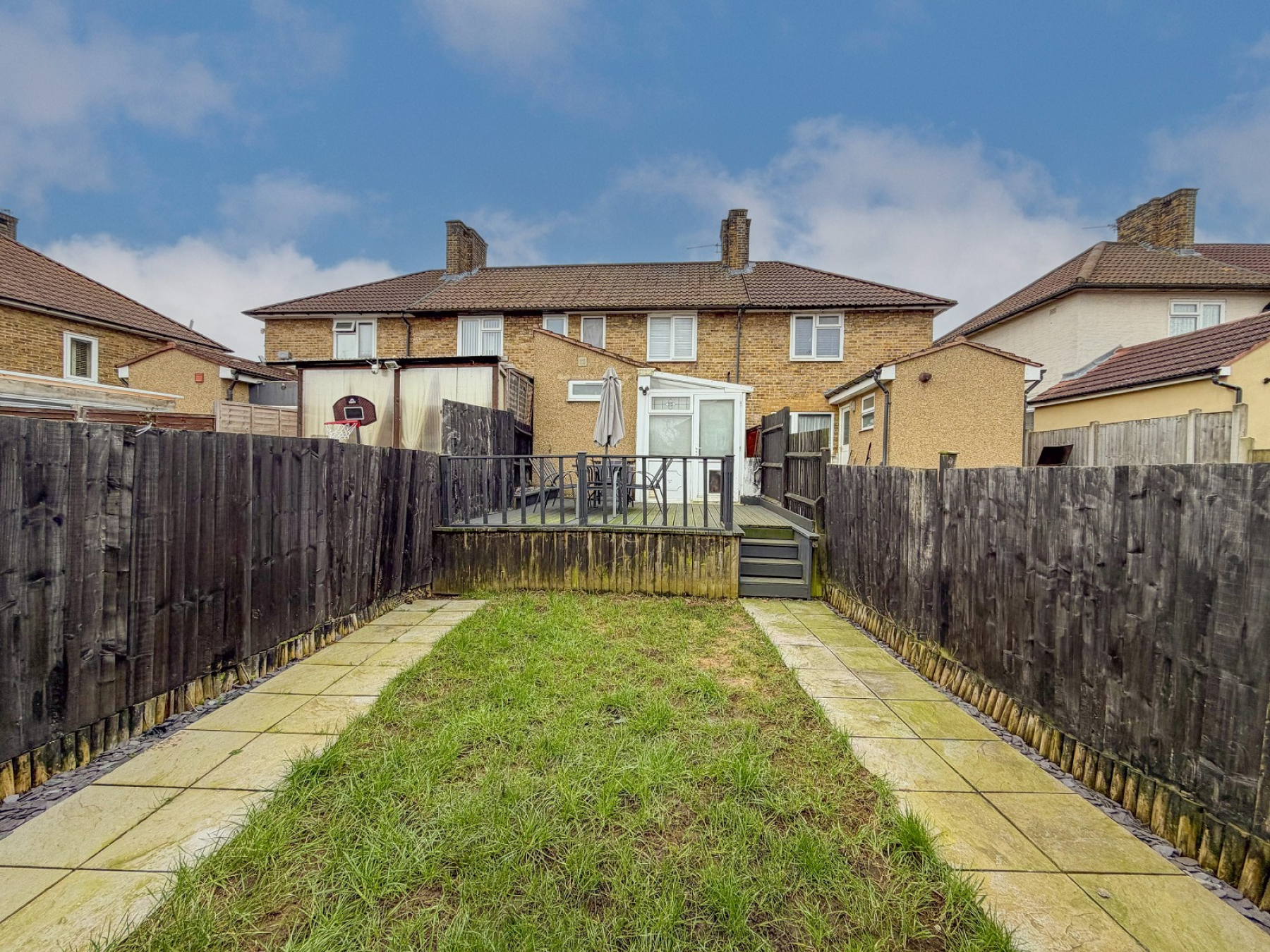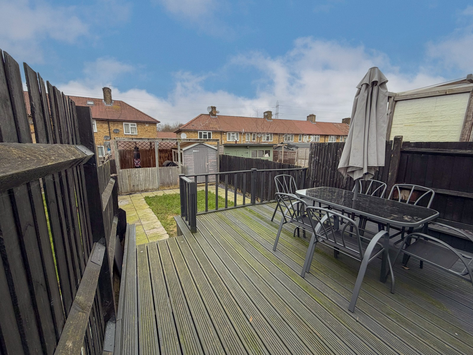 To rear of property- Garden with decking, lawn, paved area, fencing & shed